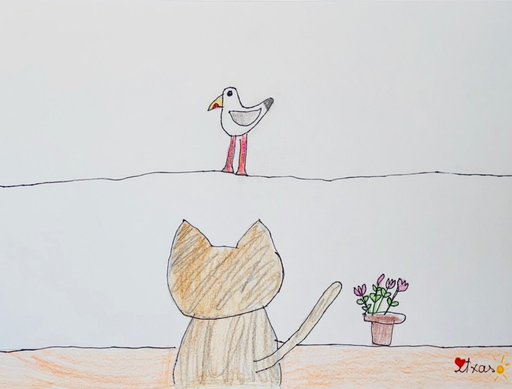 No entendía muy bien de que iba todo esto, pero decidí experimentar. Descendí del árbol y me senté en el suelo de la terraza frente a ella, colocando elegantemente el rabo en torno a mi cuerpo. Mi pelaje brillaba al sol. Tenía las uñas recogidas, bueno casi siempre las tengo recogidas. Con la experiencia que cogí durante el verano le he perdido el miedo a toda esta fauna que habita por aquí cerca. Nos conocemos mejor y saben que no tengo la menor intención de hacerles daño. Me he vuelto confiada. La gaviota no se movía de la barandilla, pero parecía también confiada. Comprendí que no quería molestarme.