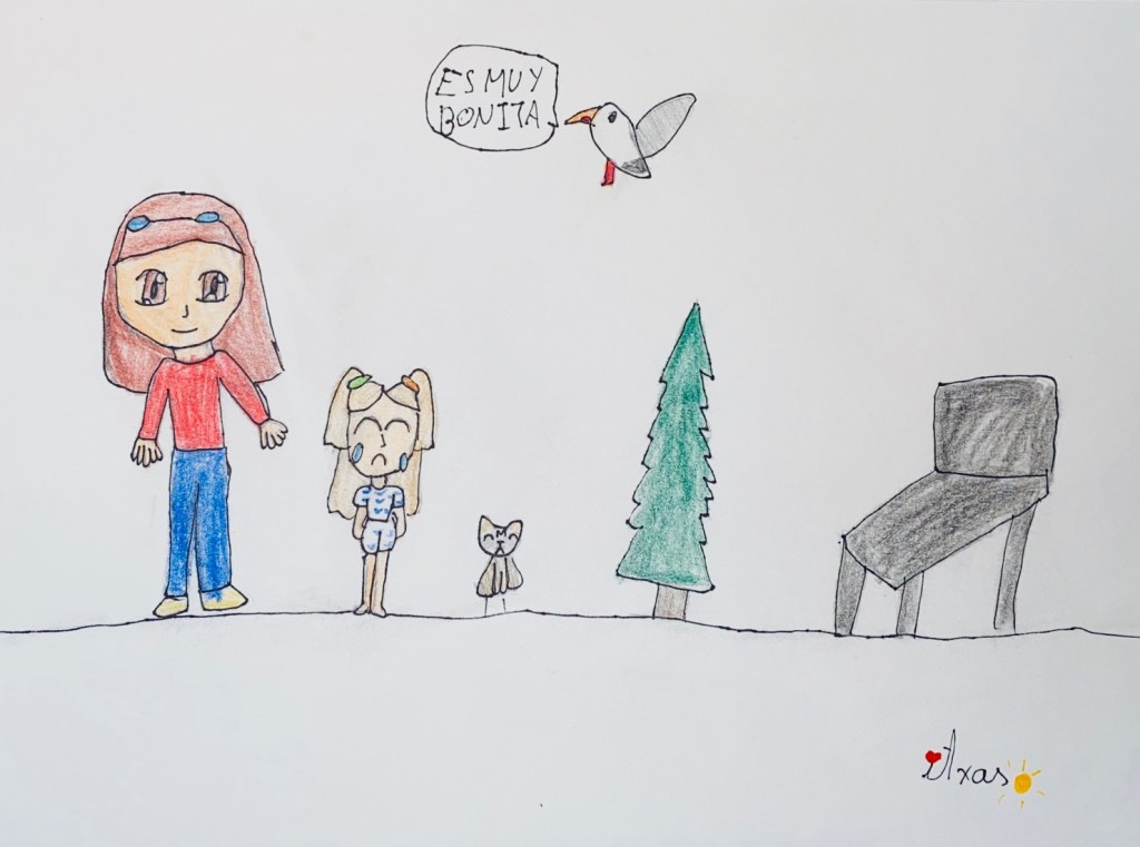 Yo también quiero descansar, tengo mucho sueño y me aburre ver a la gente bailar. Parece que los mayores solo piensan en pasárselo bien. Se me cierran los ojos cuando la novia se acerca con mi primita y una chica desconocida vestida con vaqueros y una camiseta.