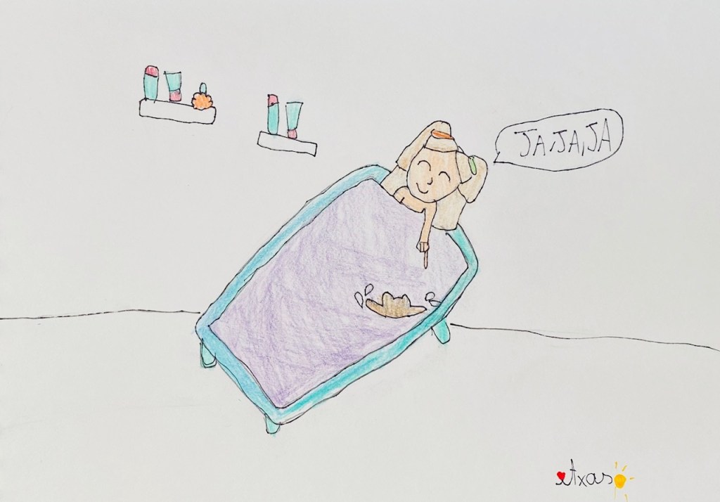 Hasta que un día la princesa ADA decidió convertir el baño en un espacio de relajación echando al agua sales, aceite de lavanda y flores de manzanilla imitando a la abuela. Metió una pierna para comprobar la temperatura, luego la otra. Se estiró a lo largo de la bañera y cerró los ojos. El olor a lavanda era un placer para mi olfato. Entonces hice todo lo posible para acercarme sigilosamente. Sé muy bien a donde puedo llegar. Me concentré cien por cien en mi objetivo observándolo con atención y cautela. Un salto con elegancia al borde de la bañera y a guardar el equilibrio.